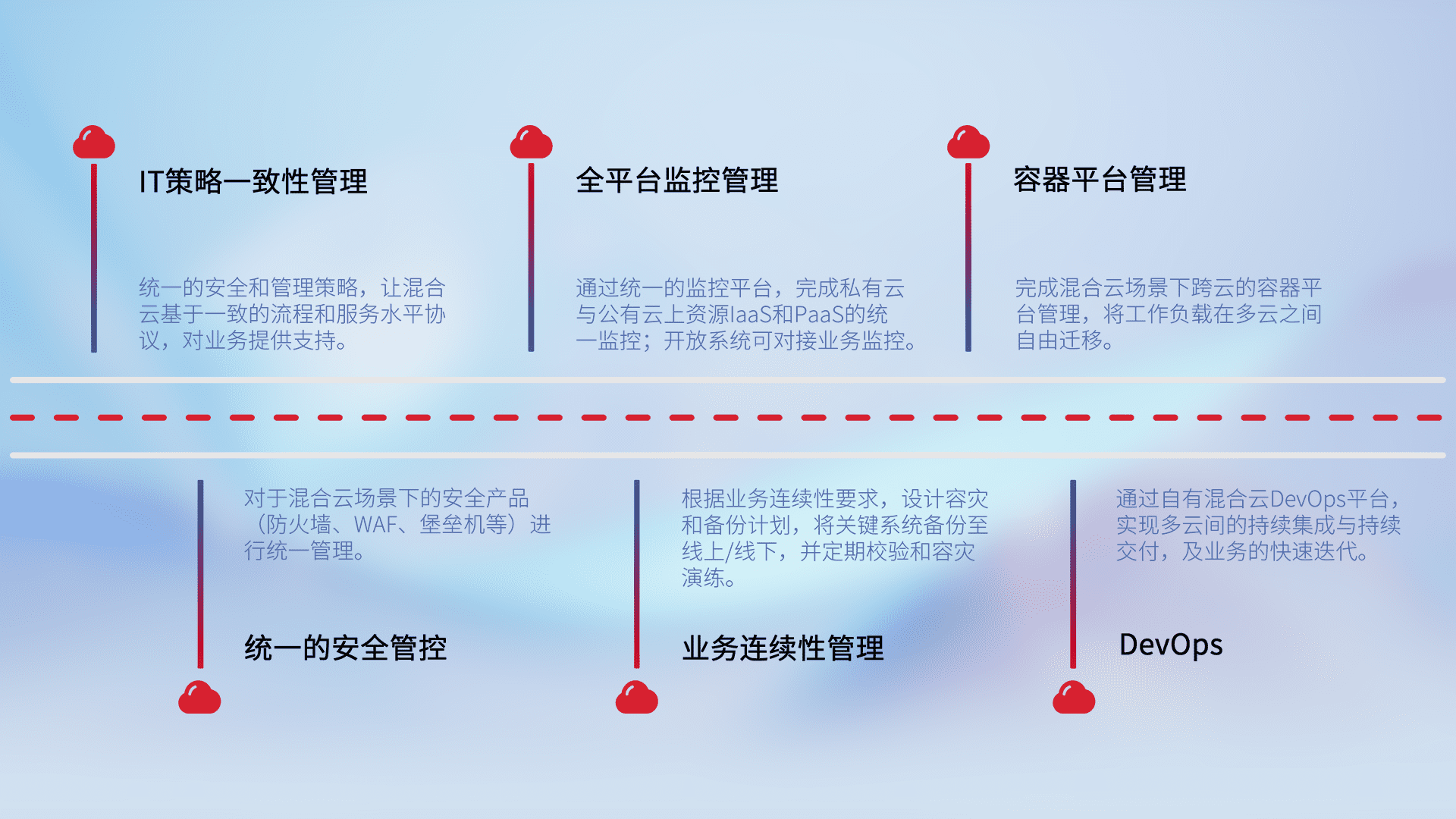 通过多云纳管,,以统一的资源数据模型把客户的云资源进行抽象和封装,,,,进而实现对多云资源的统一操作,,保障云资源管理的可靠性、、、稳定性与可用性。。量身定制化运维内容,,配置、、、开发运维、、、补丁管理、、、、备份、、、监控、、、认证和访问管理、、、、审计和日常巡检等,,保障在用云过程中的可靠度,,,稳定度以及高可用率。。。。