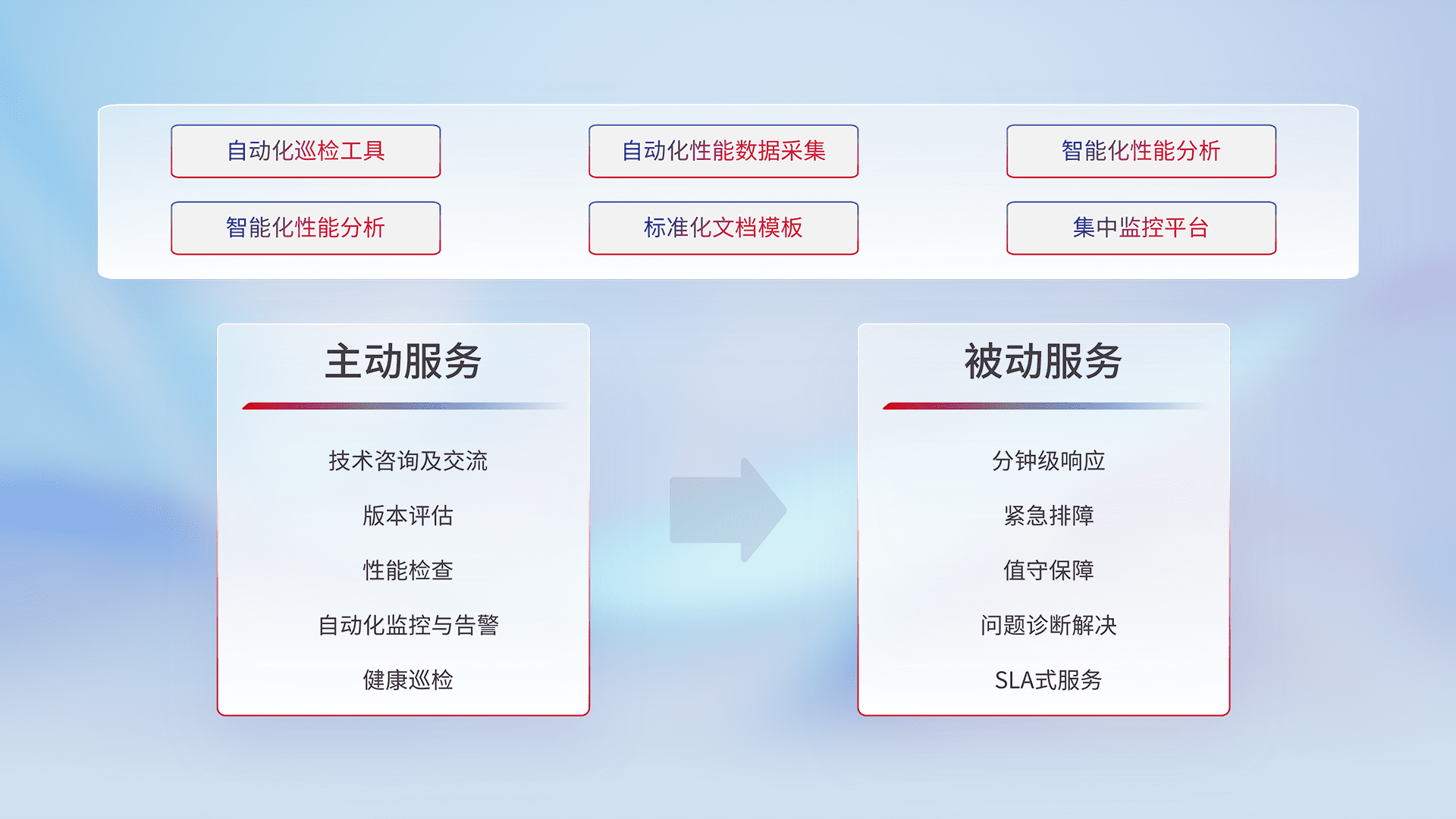 智能化工具和标准化文档,,,保障服务质量,,提供主动服务(包含技术咨询、、版本评估、、性能检查、、、自动化监控与告警、、、、健康巡检)和被动服务包含(分钟级响应、、紧急排障、、、、值守保障、、、、问题诊断解决、、SLA服务)。。