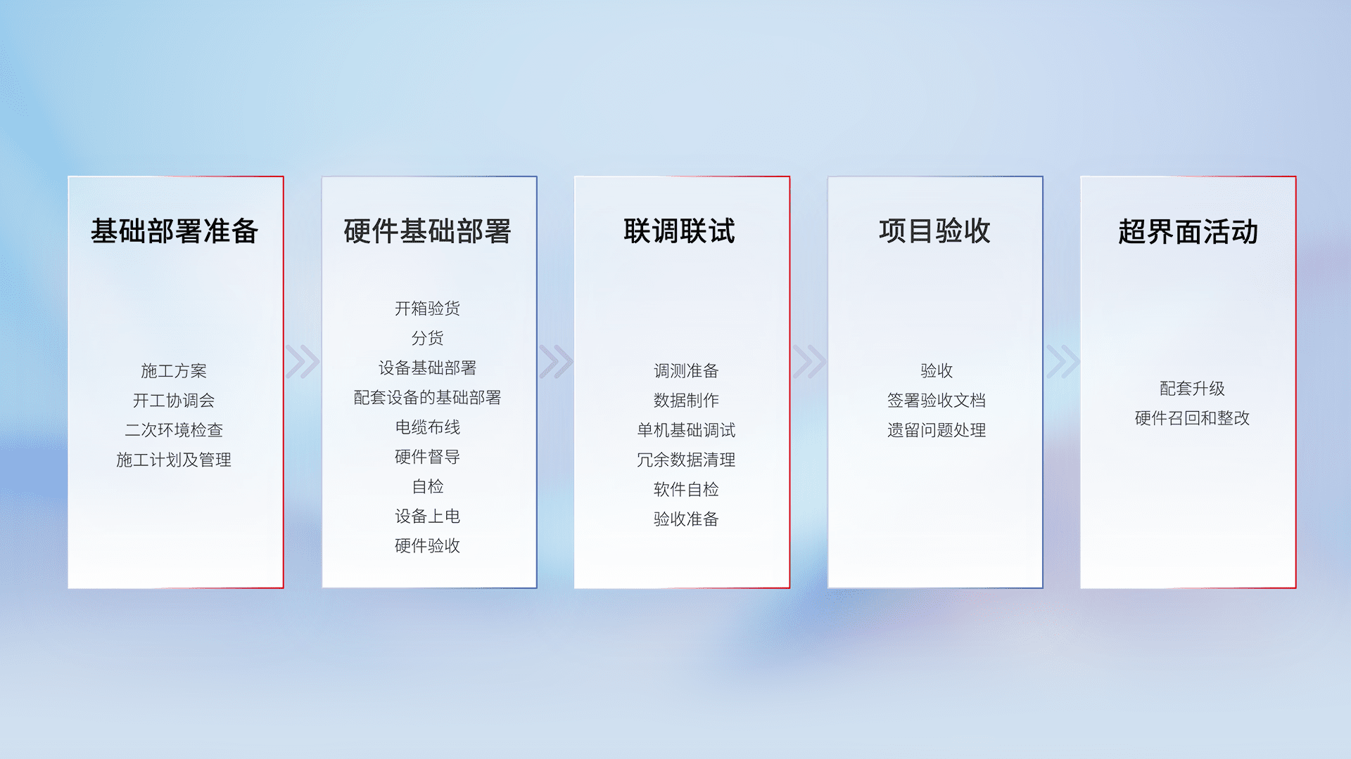 从基础部署准备、、、、硬件基础部署、、、、联调联试、、、、项目验收、、越界面活动的全过程可追溯,,,保证施工质量和进度。。